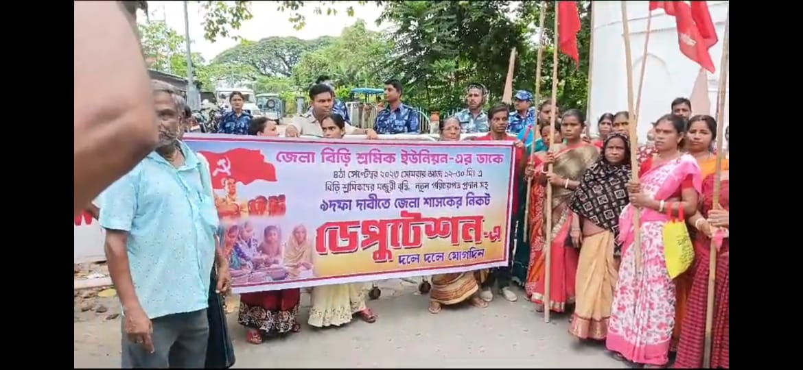কোচবিহার জেলাশাসকের দপ্তরে নয় দফা দাবিতে স্মারকলিপি প্রদান করলো কোচবিহার বিড়ি শ্রমিক ইউনিয়ন। শ্রমিকদের মজুরি বৃদ্ধি , নতুন পরিচয়পত্র প্রদান ইত্যাদি ৯দফা দাবি নিয়ে সোমবার তারা শহর জুড়ে বিশাল মিছিল করে জেলা শাষকের দপ্তরের সামনে বিক্ষোভ অবস্থান করেন তারা। এই মিছিলকে কেন্দ্র করে জেলা শাষকের দপ্তরের সামনে মোতায়েন করা হয়েছিলো বিশাল পুলিশ বাহিনী। এছাড়াও অপ্রীতিকর ঘটনা এড়াতে ব্যারিগেট করে বন্ধ করে দেওয়া হয়েছিলো জেলা শাষক দপ্তরের প্রবেশ পথ।
