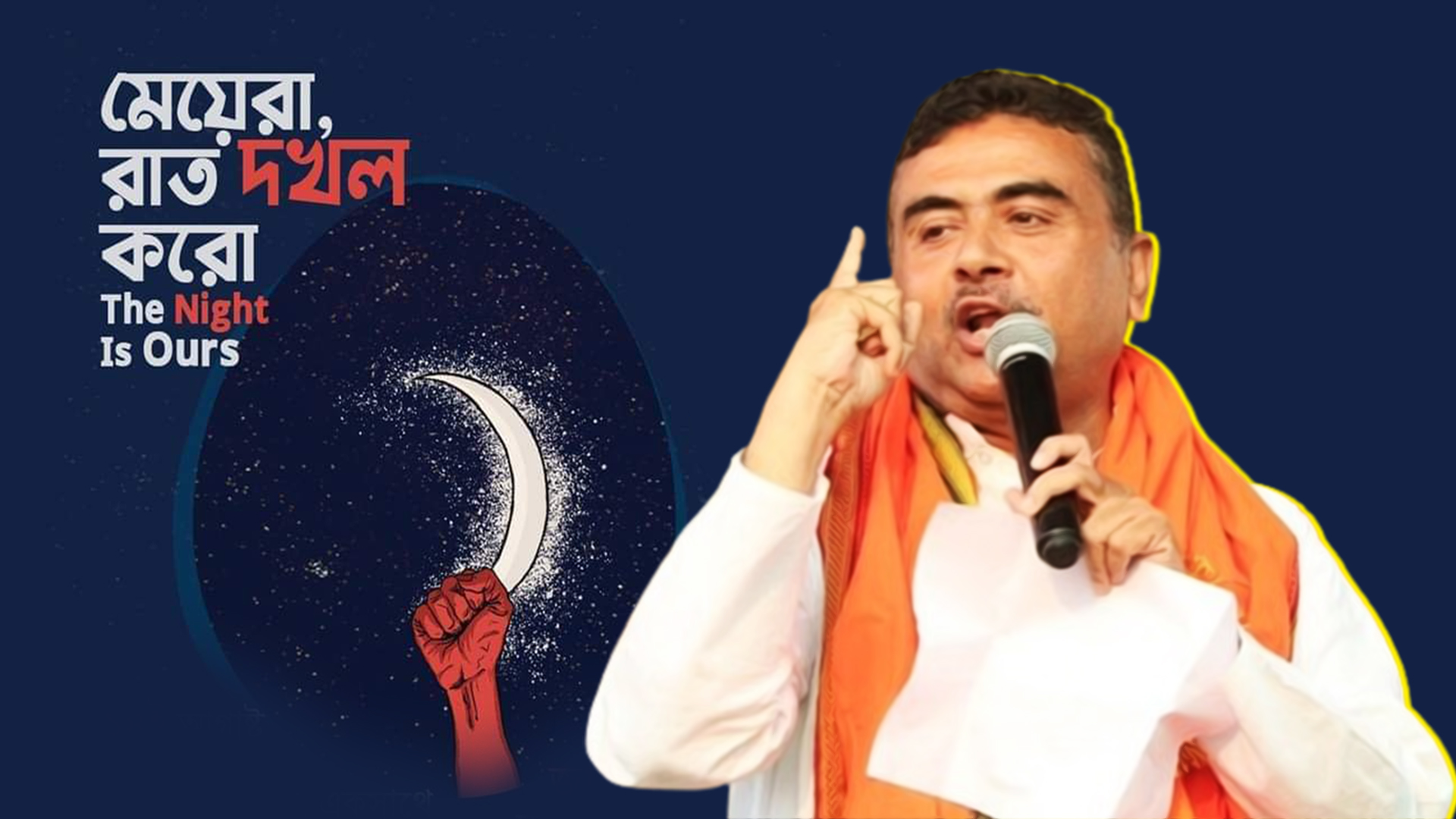 শুভেন্দু অধিকারীর বক্তব্য, ‘কোনও নির্দিষ্ট রাজনৈতিক দল এই কর্মসূচির আয়োজন করেনি। আয়োজন করেছেন সাধারণ মানুষ। আবার তৃণমূল বাদে অন্য রাজনৈতিক দলও এই আয়োজন করেছে পতাকা ছাড়াই। মূল সুরটা বেঁধে দিয়েছেন ছাত্র-ছাত্রীরা। অতএব এটা মা-বোন-দিদিরাই করবেন। আমরা যারা চিহ্নিত রাজনৈতিক ব্যক্তিত্ব, ক্যামেরার সামনে না থেকে আমাদের আড়ালে কোথাও জেগে থাকতে হবে, যাতে কোথাও তৃণমূলের গুন্ডাবাহিনী হামলা করতে না পারে, পুলিশ কোথাও টেনেহিঁচড়ে তুলে দিতে না পারে।’